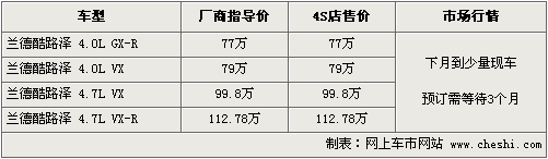 據(jù)4S店銷售人員介紹,蘭德酷路澤因價(jià)格較貴,均已訂單式銷售,所有車型需預(yù)訂,訂金為1萬(wàn)元,需等待3個(gè)月左右時(shí)間。另?yè)?jù)介紹,下月會(huì)有一臺(tái)白色頂配版現(xiàn)車到店。對(duì)此車感興趣的朋友可咨詢經(jīng)銷商處,北京地區(qū)各4S店由于訂單不同,各店銷售的現(xiàn)車顏色有所不同。