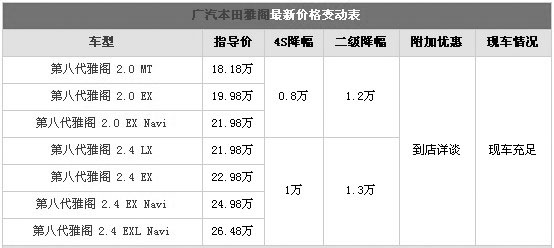 雅閣目前共有2.0、2.4和3.5三個(gè)排量8款車型在售。雅閣2.0 MT標(biāo)配ABS/EBD和前后排安全氣囊和前排側(cè)氣囊等安全裝置,同時(shí)配備了單碟CD、前后電動(dòng)車窗和中控臺(tái)彩屏等配置;2.0 EX在2.0 MT配置的基礎(chǔ)上增加了電動(dòng)天窗、真皮座椅和真皮方向盤等配置;2.0 EX NAVI則在2.0 EX配置的基礎(chǔ)上增加了GPS、多碟DVD以及內(nèi)置硬盤等配置。