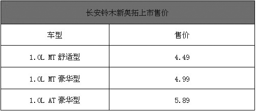 9月16日,長安鈴木新奧拓正式上市。此次上市的新奧拓將推出1.0L排量三款車型,分別為1.0L手動舒適型、1.0L手動豪華型和1.0L自動豪華型,售價在4.49-5.89萬元之間。具體售價如下表:長安鈴木新奧拓上市售價
