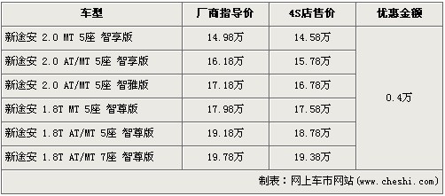 據(jù)北京上海大眾4S店銷(xiāo)售人員介紹,目前購(gòu)買(mǎi)新途安的消費(fèi)者可以得到4000元的現(xiàn)金優(yōu)惠。全系價(jià)格最低的2.0MT 5座智享版車(chē)型經(jīng)優(yōu)惠后,售價(jià)從14.98萬(wàn)元下降到了14.58萬(wàn)元。銷(xiāo)售人員還介紹,目前新途安全系車(chē)型比較充足,消費(fèi)者挑選的空間很大。