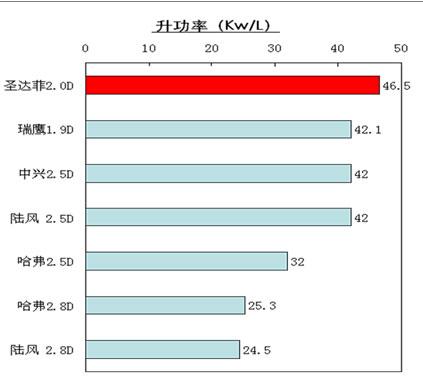 通過(guò)發(fā)動(dòng)機(jī)的對(duì)比(上表),我們不難發(fā)現(xiàn),在發(fā)動(dòng)機(jī)的功率和扭矩方面中興和陸風(fēng)略勝一籌,然而在真正反映發(fā)動(dòng)機(jī)動(dòng)力技術(shù)水平的指標(biāo)——升功率上,排量較小的圣達(dá)菲2.0T則領(lǐng)先排名第二的瑞鷹10.5。