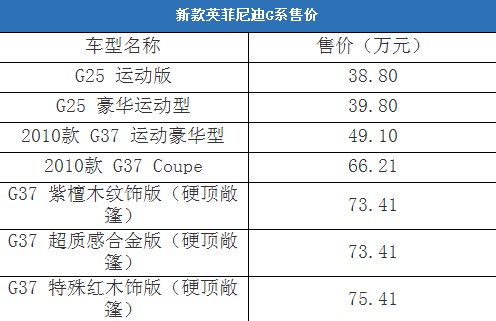 1月11日,英菲尼迪G系全線上市。其中,英菲尼迪 G37硬頂敞篷跑車為人民幣75.41萬元(特殊紅木飾版)和73.41萬元(木飾版);G25 運(yùn)動型豪華轎車售價為人民幣39.8萬元(豪華運(yùn)動版)和38.8萬元(運(yùn)動版)。同期上市的還有2010款英菲尼迪 G37雙門跑車和四門運(yùn)動型豪華轎車,售價分別為人民幣66.21萬元和49.1萬元。