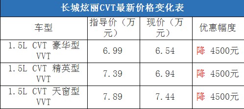 近日,編輯從北京地區(qū)綜合經(jīng)銷商處了解到,購買長城炫麗CVT車型有4500元的現(xiàn)金優(yōu)惠,店內(nèi)有黑色現(xiàn)車在售,部分車型預定等待10天左右就可以提車。據(jù)經(jīng)銷商透露,消費者要想以這個價格提車,需要在店內(nèi)做購車一條龍服務(wù),其中車輛四項基本保險可以打8折(約合2800-2900元左右)。以下是長城炫麗CVT最新價格變化表: