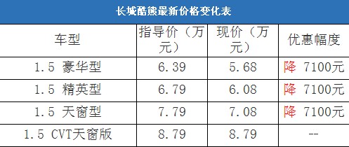 近日,編輯從長城汽車4S經(jīng)銷商處了解到,酷熊前段時間購車送鉆石的促銷活動已經(jīng)結束,目前在店內購車沒有任何優(yōu)惠。相比之下,在綜合經(jīng)銷商處購車的消費者可以享受7100元的現(xiàn)金優(yōu)惠。據(jù)經(jīng)銷商透露,酷熊的CVT版車型也可以預定,定金為2000元,等待15個工作日就可以提車,但是購車沒有任何優(yōu)惠。以下是長城酷熊最新價格變化表: