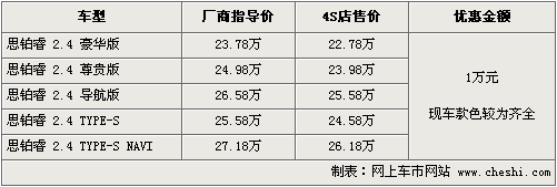 據(jù)東風(fēng)本田4S店銷售人員介紹,目前購買思鉑睿全系優(yōu)惠1萬元,入門級車型優(yōu)惠后最低售價為22.78萬元,F(xiàn)在店內(nèi)大部分車型現(xiàn)車充足,款色比較齊全,顏色以黑色、銀色等現(xiàn)車供應(yīng),運動版有少量紅色現(xiàn)車供應(yīng)。購買豪華版和尊貴版如果加導(dǎo)航的話,另外需加1.2萬元左右,相比而言導(dǎo)航版車型更為超值。如消費者有意購買,到店詳談會有更優(yōu)惠的價格。北京地區(qū)各4S店由于訂單不同,各店銷售的現(xiàn)車顏色有所不同。