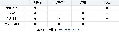 總的來看C5的配置單還是比較有誠意的,基本能做到“人無我有”。比較尷尬的是凱美瑞,作為一款2.4L,價格在20萬左右的中級車型,標配里不含真皮座椅,也許會讓一部分消費者望而卻步。
