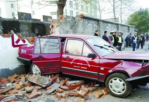 駕校訓(xùn)練場(chǎng)與路面落差有2米多高,這輛教練車(chē)接連沖破了圍欄、隔離墩和圍墻。 網(wǎng)友 王梓媽 本報(bào)記者 董旭明 攝