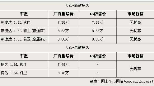 據(jù)北京一汽大眾經(jīng)銷店銷售人員介紹,大眾全新捷達1.6L分為伙伴版以及前衛(wèi)版兩種車型,售價分別為7.58萬元和8.88萬元,由于前衛(wèi)版白色車型采用的是普通漆油料,所以在廠商指導(dǎo)價方面會比前衛(wèi)版其他顏色車型便宜2500元,售價為8.63萬元。銷售人員還介紹,老款的大眾捷達已經(jīng)沒有現(xiàn)車,消費者已經(jīng)無法購買到。