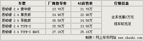 東風(fēng)本田旗下的首款運(yùn)動(dòng)中高級(jí)車型——思鉑睿于09年9月初上市,全系共計(jì)五款車型,售價(jià)為23.78萬(wàn)元—27.18萬(wàn)元。上根據(jù)網(wǎng)上車市價(jià)格監(jiān)測(cè)系統(tǒng)顯示,目前購(gòu)買思鉑睿全系可優(yōu)惠現(xiàn)金2萬(wàn)元,現(xiàn)車方面較為齊全。具體車型行情如下: