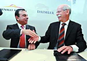 2010年4月7日,比利時(shí)布魯塞爾,當(dāng)戴姆勒集團(tuán)董事會主席迪特·蔡澈與雷諾-日產(chǎn)聯(lián)盟主席卡洛斯·戈恩同時(shí)在一份看起來非常簡樸的文件上簽字之后,世界汽車工業(yè)的格局再次發(fā)生了重大改變,戴姆勒-雷諾-日產(chǎn)新組成的聯(lián)盟,一躍成為排在豐田和大眾-鈴木聯(lián)盟之后的世界第三大汽車聯(lián)盟。