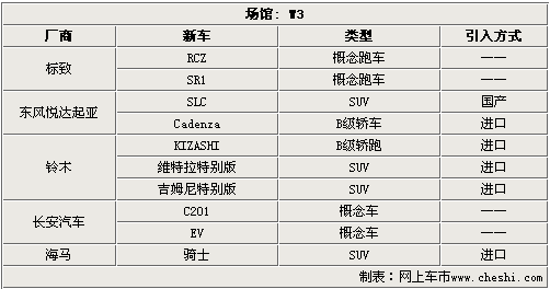 在W3館中,共有7家汽車廠商在此參展,除雪鐵龍/東風雪鐵龍和開瑞外,其余廠商如標致將帶來兩款概念車RCZ和SR1;東風悅達起亞將帶來即將國產(chǎn)的SUV車型——SLC(海外版新獅跑)和以進口方式引入的新中級車——Cadenza,鈴木將在本屆車展中帶來三款車型,其中新款轎跑車KAZASHI是最大的亮點。自主品牌也不甘寂寞,長安汽車和海馬汽車分別帶來了C201概念車和SUV車型——騎士。