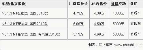 夏利車(chē)型在國(guó)內(nèi)的銷(xiāo)量一直都處于很平穩(wěn)的高度,超高的性價(jià)比成就了夏利車(chē)型出色的認(rèn)可度。天津一汽夏利與去年年底推出了全新夏利N5車(chē)型,在夏利其他車(chē)型光環(huán)的照耀下,N5同樣交出了一份很出色的答卷。近期,網(wǎng)上車(chē)市走訪了天津一汽夏利北京地區(qū)4S店,了解到夏利N5最新的市場(chǎng)信息,具體信息請(qǐng)參考下表: