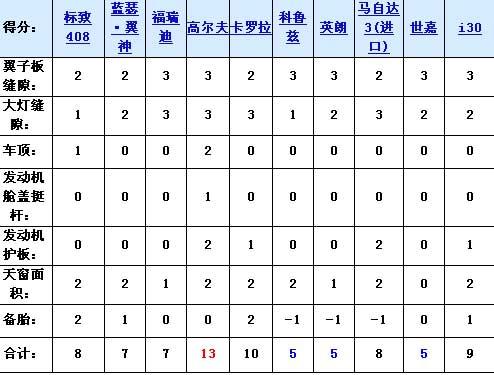 不難看出,標(biāo)致408雖然夠大,但他的做工和細(xì)節(jié)并不像看上去那么精細(xì),在10款緊湊型車中僅僅處于中等水平;藍(lán)瑟·翼神各方面中規(guī)中矩,沒有突出的亮點(diǎn);福瑞迪的外觀縫隙控制最出色,但天窗面積和備胎令人不爽;身材最小的高爾夫6因?yàn)榫哂芯?xì)的外部做工,大面積的天窗和發(fā)動(dòng)機(jī)護(hù)板而在外觀方面有一定的優(yōu)勢,同時(shí)他的外觀也是十分招人待見的,只不過不停的減配令人很不爽;卡羅拉中庸但沒有明顯的短板,所以得分也不低;來自于通用集團(tuán)的科魯茲和英朗存在同樣的問題:大燈縫隙有點(diǎn)大,小備胎令人很很懊惱;進(jìn)口馬自達(dá)3如果不是因?yàn)樾涮サ脑,那么成績也不錯(cuò);世嘉除了縫隙控制得還可以以外,其他方面沒有任何亮點(diǎn);i30的表現(xiàn)卻比想象中強(qiáng)大,各方面均衡,成績僅次于卡羅拉。