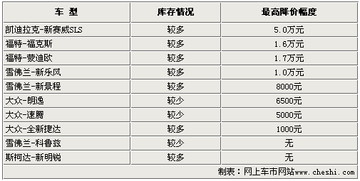 我們選取了目前市場(chǎng)上熱銷的大眾朗逸、福特?怂沟10款車型。經(jīng)過我們?cè)诒本┦袌?chǎng)的調(diào)查后發(fā)現(xiàn),這些車型目前的庫(kù)存量較上個(gè)月均有所上升,大部分車型的價(jià)格開始出現(xiàn)松動(dòng),最高降幅達(dá)5萬元。而也有部分新上市不久的車型價(jià)格仍然堅(jiān)挺,但是現(xiàn)車明顯增多。