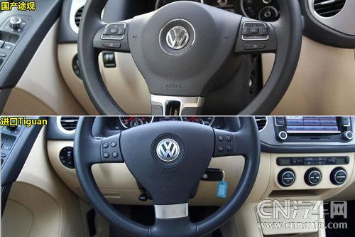 內(nèi)飾及細(xì)節(jié)差異:國(guó)產(chǎn)車(chē)型在一些細(xì)節(jié)設(shè)計(jì)上要更具優(yōu)勢(shì),比如方向盤(pán)采用了高爾夫6式的新風(fēng)格,方向盤(pán)輻條和多功能按鍵在金屬鍍鉻的裝飾下,明顯更具質(zhì)感。此外,包括大燈調(diào)節(jié)旋鈕、電動(dòng)車(chē)窗按鈕都增加了金屬風(fēng)格的裝飾。雙區(qū)自動(dòng)恒溫空調(diào)也啟用了和斯柯達(dá)昊銳相同款式的最新設(shè)計(jì)面板。而在一些并不是十分重要的配置上,國(guó)產(chǎn)車(chē)型省略后以進(jìn)一步降低價(jià)格,比如音響面板上方的副駕駛席氣囊指示燈變成了卡片槽,手套箱中的副氣囊開(kāi)關(guān)也沒(méi)有再出現(xiàn)。國(guó)產(chǎn)車(chē)型由于兩種排量多達(dá)8款車(chē)型配置,導(dǎo)航系統(tǒng)、全景天窗都可以選裝配置也讓消費(fèi)者多了更多選擇。尤其是對(duì)于低端消費(fèi)者,國(guó)產(chǎn)途觀還是具備相當(dāng)?shù)奈Α?/p>