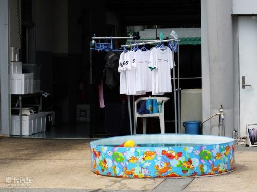 走進賽車場后,我們發(fā)現(xiàn)每個pit房后面都有一個兒童游泳池↑