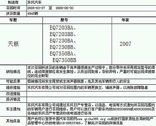 消聲器存在隱患 東風(fēng)日產(chǎn)召回4945輛天籟轎車