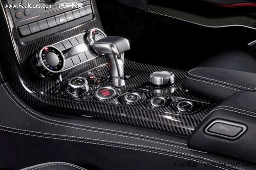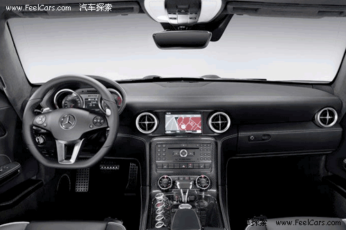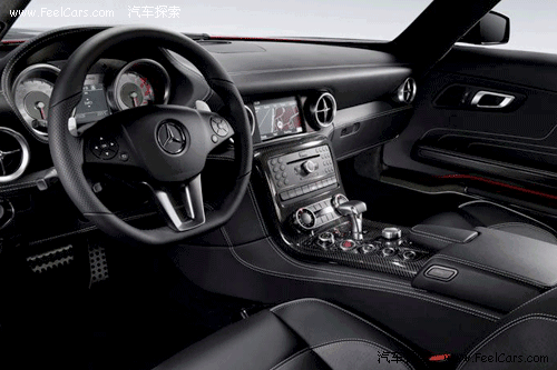 看到內(nèi)飾的第一感覺(jué)就是運(yùn)動(dòng)感很強(qiáng),無(wú)論是全黑色的真皮內(nèi)飾,還有鑲嵌點(diǎn)綴在各處的碳纖維面板,或者是三輻、平底的真皮方向盤,像瞄準(zhǔn)鏡一般的空調(diào)出風(fēng)口等等,都毫不客氣的顯露出了SLS以運(yùn)動(dòng)為本的設(shè)計(jì)理念,當(dāng)然,這也是在向前輩300SL致敬。