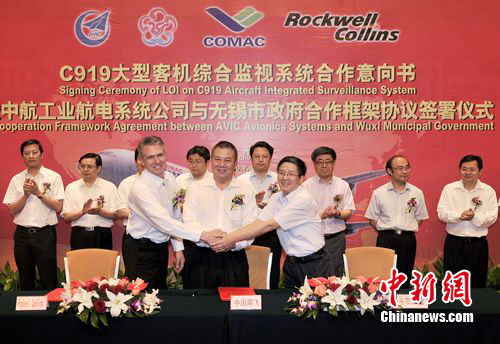 中新網(wǎng)無錫7月8日電(記者 孫權)中國商用飛機有限責任公司、中航工業(yè)雷達與電子設備研究院和美國羅克韋爾柯林斯公司三方今日在無錫“握手”,確定國產(chǎn)C919大型客機綜合監(jiān)視系統(tǒng)的研制生產(chǎn)項目落戶無錫市濱湖區(qū)。幾年后,裝備“無錫造”綜合監(jiān)視系統(tǒng)的C919大型客機,將翱翔在中國的藍天,并飛行在世界各地。