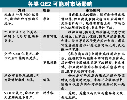 聯(lián)儲(chǔ)局內(nèi)部明顯分裂,部分鷹派官員至近日仍不斷公開抨擊QE2,因此QE2最終規(guī)模大小仍存在變量。目前,市場普遍預(yù)期,聯(lián)儲(chǔ)局將宣布先在未來5個(gè)月購買5000億美元債券,并為之后再買更多資產(chǎn)留下空間。