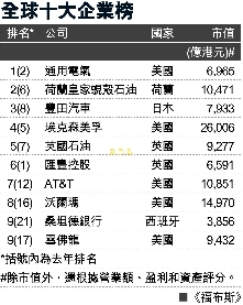 據(jù)香港《文匯報(bào)》消息,《福布斯》根據(jù)綜合評分定出是項(xiàng)排名,營業(yè)額、盈利、資產(chǎn)和市值占同等比重。三甲位置分別由美國通用電氣、荷蘭皇家蜆殼石油和日本豐田汽車奪得,十大位置中,美國占了5席。