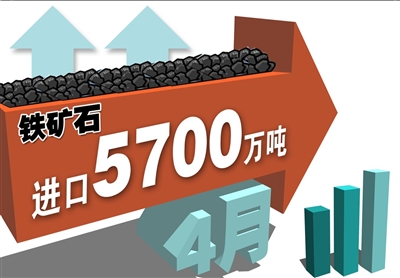 海關(guān)12日公布的數(shù)據(jù)顯示,4月份,我國鐵礦石進(jìn)口5700萬噸,創(chuàng)造了歷史新高。我國鐵礦石進(jìn)口自1月以來連續(xù)4個(gè)月攀升,1-4月份合計(jì)進(jìn)口鐵礦石18846萬噸,累計(jì)增長22.9%。