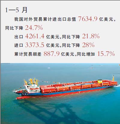 在內(nèi)需呈現(xiàn)升溫態(tài)勢的同時,外需仍然持續(xù)萎縮。據(jù)海關統(tǒng)計,5月份當月,我國進出口總值1641.3億美元,同比下降25.9%,降幅比今年前4個月累計同比降幅加深1.5個百分點。其中出口887.6億美元,降幅加深5.9個百分點,進口753.7億美元,降幅收窄3.6個百分點。