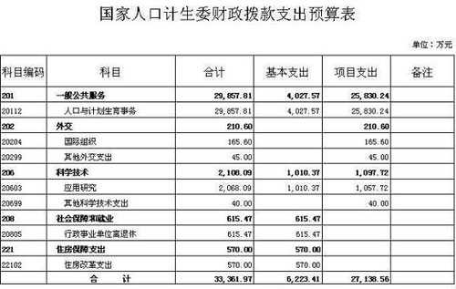 本表按支出功能分類科目編制,反映國(guó)家人口計(jì)生委年度部門預(yù)算中財(cái)政撥款支出的總體情況,按照基本支出和項(xiàng)目支出劃分。