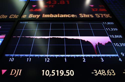這是5月6日,紐約證券交易所內電子顯示屏顯示的紐約股市收盤指數(shù)。在歐洲債務危機的重壓下,紐約股市6日暴跌,截至收盤,三大股指的跌幅均超過3%,而道瓊斯指數(shù)盤中瞬間曾一度下跌近1000點。 新華社/路透