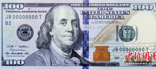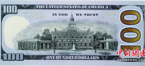 美國(guó)財(cái)政部公布了新版100元美鈔的照片,鈔票上同樣仍是美國(guó)開(kāi)國(guó)元老之一的富蘭克林(Benjamin Franklin)肖像,但鈔票正中央多了一道藍(lán)色的3D立體安全圖樣,隨著角度不同,可以變換鐘或數(shù)字100的圖型。