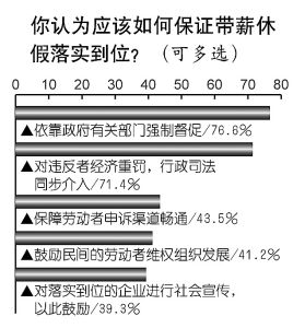 民調(diào)顯示,對于保證帶薪休假落實到位,76.6%的公眾認為要依靠政府有關(guān)部門強制督促,大力推行;71.4%的人認為要對違反者經(jīng)濟重罰,行政司法同步介入。接下來,公眾給出的排序是:保障勞動者申訴渠道暢通(43.5%);鼓勵民間的勞動者維權(quán)組織發(fā)展(41.2%);對落實到位的企業(yè)進行社會宣傳,以此鼓勵(39.3%)。(實習生 汪東亞)