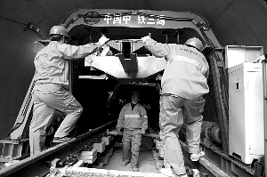 “目前的鋪軌技術(shù)是國內(nèi)最先進的,25米的鋼軌在地面形成軌排,然后機械下到地下進行鋪裝!敝需F一局軌道項目經(jīng)理表示,目前一個基地每天的鋪軌進度是150米。“28公里的軌道線上,8.5公里路段采用了減震處理。”該負(fù)責(zé)人表示,4號線是北京減震處理最多的一條地鐵。