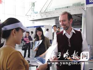 招聘會上,A036號展位人氣很足,令記者吃驚的是,展位前負(fù)責(zé)發(fā)放傳單的竟是一個外國人。他白襯衣加褐色背心,胸前掛著一副眼鏡。對路過展位的應(yīng)聘者,他不時遞上公司的傳單,面帶笑容,有時還用英文交流幾句,碰到用中文問話的則一律回答“什么”,模樣十分可愛。展位的工作人員告訴記者,他們這次招募的是到美、英帶薪實習(xí)人員,而這位“老外”可不是打雜的,他是公司的高級咨詢師。