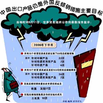 世貿(mào)組織早前發(fā)布的反傾銷(xiāo)統(tǒng)計(jì)報(bào)告顯示,從1995年至2006年,中國(guó)已連續(xù)12年成為世界上遭受反傾銷(xiāo)調(diào)查和被實(shí)施反傾銷(xiāo)措施數(shù)量最多的國(guó)家,2007年全球新立案的反傾銷(xiāo)調(diào)查雖呈下降趨勢(shì),但中國(guó)仍然是全球反傾銷(xiāo)調(diào)查的頭號(hào)目標(biāo)國(guó)。