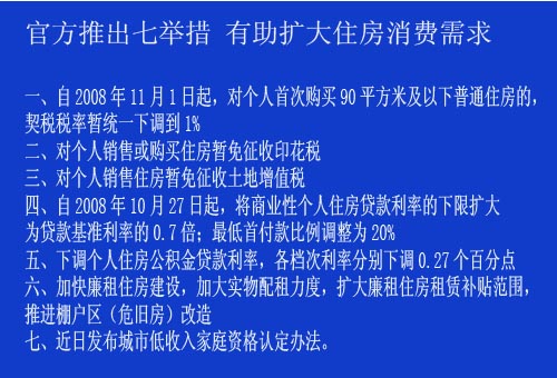 從2008年11月1日起,對(duì)個(gè)人首次購(gòu)買(mǎi)90平方米及以下普通住房的,契稅稅率暫統(tǒng)一下調(diào)到1%;對(duì)個(gè)人銷(xiāo)售或購(gòu)買(mǎi)住房暫免征收印花稅;對(duì)個(gè)人銷(xiāo)售住房暫免征收土地增值稅。地方政府可制定鼓勵(lì)住房消費(fèi)的收費(fèi)減免政策。[詳細(xì)內(nèi)容]