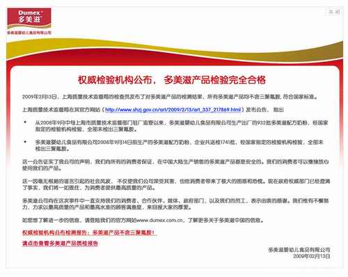 對(duì)于報(bào)道中介紹的那些患兒,我深表關(guān)切,我們理解父母?jìng)儞?dān)憂的心情。但迄今沒有醫(yī)學(xué)報(bào)告可以證明任何多美滋產(chǎn)品與這些病癥的關(guān)聯(lián)性。我想再次向我們的員工申明,多美滋在國內(nèi)生產(chǎn)銷售的奶粉全部符合中國相關(guān)標(biāo)準(zhǔn)。所有批次的產(chǎn)品都經(jīng)過了官方認(rèn)證的實(shí)驗(yàn)室的檢驗(yàn),被確認(rèn)不含三聚氰胺。同時(shí),質(zhì)檢系統(tǒng)駐廠人員還在對(duì)我們(當(dāng)然還有其它所有的乳品品牌)的生產(chǎn)和產(chǎn)品質(zhì)量進(jìn)行不間斷的監(jiān)督。