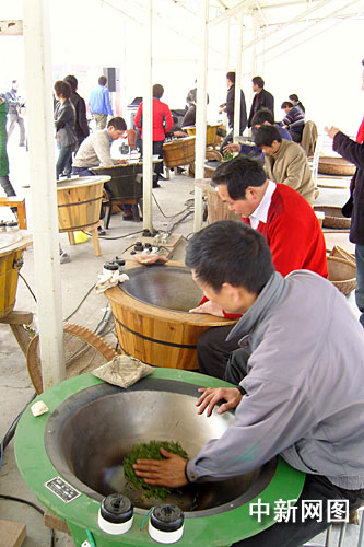 3月25日上午8時(shí),剛下過(guò)濛濛細(xì)雨的天空漸漸放晴,西湖區(qū)2009年西湖龍井“炒茶王”爭(zhēng)霸賽在龍塢茶葉交易中心順利舉行。說(shuō)來(lái)也巧,在首輪抽簽環(huán)節(jié)中,兩位往年的“炒茶王”相繼抽到了1號(hào)和2號(hào),面對(duì)面地形成了“炒茶王”爭(zhēng)霸賽的第一個(gè)高潮——“雙王爭(zhēng)霸”的精彩場(chǎng)面。為公平比賽,此次所有參賽選手炒制的青葉原料都來(lái)自同一塊茶地。比賽中,每位選手都領(lǐng)到了2斤青葉,在經(jīng)過(guò)殺青、輝鍋、整理、二次輝鍋等工序后,以抽簽號(hào)裝袋后送由國(guó)家級(jí)一、二級(jí)評(píng)茶師和龍井茶葉產(chǎn)業(yè)協(xié)會(huì)秘書長(zhǎng)等評(píng)茶高手組成的評(píng)審團(tuán)評(píng)審。評(píng)審團(tuán)則通過(guò)觀、聞、品等方法,對(duì)各位選手炒制的茶葉外形、香氣、滋味、湯色、葉底等進(jìn)行打分,最后以綜合得分的高低產(chǎn)生“炒茶王”。
