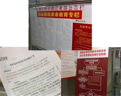 在招商證券公司的這家營業(yè)部,記者注意到公司大門外的墻面上,張貼著不少關(guān)于創(chuàng)業(yè)板的知識(shí)介紹、開戶流程等信息,而開戶大廳里人頭攢動(dòng)。