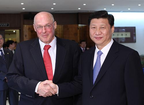 在會(huì)見保爾森時(shí),習(xí)近平說,中美都是世界上有重要影響的國家。在推動(dòng)世界經(jīng)濟(jì)復(fù)蘇和可持續(xù)增長、處理國際和地區(qū)熱點(diǎn)問題以及維護(hù)世界和平與安全等方面,中美兩國擁有廣泛的共同利益,肩負(fù)著重要責(zé)任。中方一貫高度重視中美關(guān)系,愿與美方共同努力,尊重彼此核心利益和重大關(guān)切,妥善處理分歧和敏感問題,加強(qiáng)各領(lǐng)域?qū)υ挕⒔涣髋c合作,推動(dòng)中美關(guān)系沿著積極合作全面的軌道向前發(fā)展。習(xí)近平深入闡述了中方在中美經(jīng)貿(mào)關(guān)系、人民幣匯率等問題上的原則立場,期待保爾森繼續(xù)發(fā)揮影響力,為促進(jìn)中美在經(jīng)濟(jì)金融領(lǐng)域的對話合作和后國際金融危機(jī)時(shí)期兩國經(jīng)濟(jì)關(guān)系健康穩(wěn)定發(fā)展發(fā)揮積極作用。