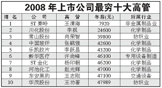 根據(jù)這份榜單,2008年上市公司最窮總經理30人的平均年薪是56373元,而最窮總經理前十名的平均年薪只有39251元。