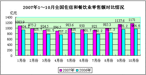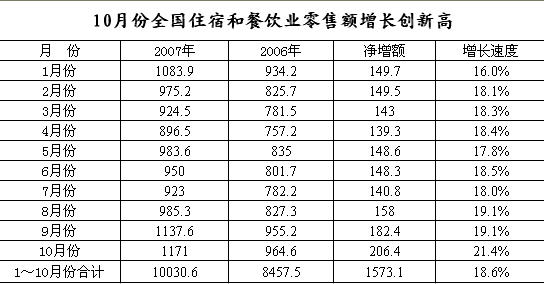 今年1-10月份,全國住宿與餐飲業(yè)零售額累計(jì)實(shí)現(xiàn)10030.6億元,同比增長18.6%,比去年同期增幅高出2.4個百分點(diǎn),占社會消費(fèi)品零售總額的13.9%,拉動社會消費(fèi)品零售總額增長2.5個百分點(diǎn),對社會消費(fèi)品零售總額的增長貢獻(xiàn)率為15.7%。