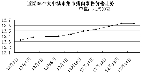 中新網(wǎng)12月18日電 國(guó)家發(fā)改委網(wǎng)站消息稱,據(jù)國(guó)家發(fā)展改革委價(jià)格監(jiān)測(cè)中心監(jiān)測(cè),上周(12.10-12.14,下同)全國(guó)36個(gè)大中城市集市豬肉(精瘦肉)平均零售價(jià)格每500克為13.57元,比前一周(12.3-12.7,下同)上漲1.34%。