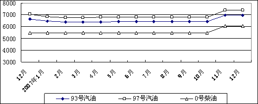 12月份,成品油供應(yīng)緊張局面有所緩解,市場(chǎng)價(jià)格保持基本平穩(wěn)。36個(gè)大中城市加油站90號(hào)、93號(hào)、97號(hào)汽油和0號(hào)柴油實(shí)際零售價(jià)格分別為每噸6569元、6985元、7384和6039元,均與上月基本持平。