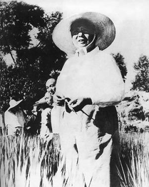 毛澤東到成都就說了要到一個(gè)合作社看看。時(shí)任中共四川省委第一書記的李井泉深諳主席習(xí)性,提前吩咐新都和郫縣各安排一個(gè)社作好準(zhǔn)備:出金牛賓館的大門往左是新都的那個(gè)社,往右即郫縣的紅光社。兩個(gè)縣的縣委第一書記放下一切事情,每天騎著自行車專門等候在金牛賓館大門口。三月十六號(hào)下午四點(diǎn)左右,毛澤東午睡起床以后,決定到鄉(xiāng)下走走,在李井泉的陪同下,汽車駛出招待所大門,李井泉問毛澤東往哪邊走,偉人之手朝右邊一揮,就描繪出了紅光社的一頁濃墨重彩和光輝歷史,同樣等候于此的新都的女縣委書記,因此傷心地大哭了一場。