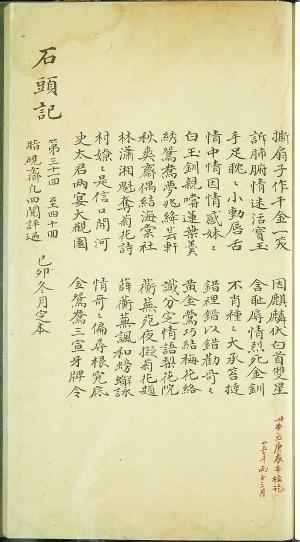 庚辰本存七十八回(1-80回,內(nèi)缺64、67兩回),此本第41回以后的四個(gè)總目錄頁上題有“庚辰秋(月)定本”字樣,故通稱“庚辰本”。此本亦有與己卯本相同的雙行小字批,另有大量的行間批和眉批。此本部分手抄筆記與己卯本相同,行款題字、少數(shù)抄漏空行、抄胥提示,甚至個(gè)別如“祥”字的避諱均與己卯本相同,昭示這兩個(gè)本子間的特殊密切關(guān)系,由此本可窺視己卯本的大略。此本批語中資料豐富,價(jià)值極高。人民文學(xué)出版社1982年首版,迄今印行已逾400萬套的《紅樓夢(mèng)》校注本的前八十回即以庚辰本為底本(后四十回以程甲本為底本)。庚辰本1933年徐星署花八塊大洋,購于隆福寺;后燕京大學(xué)圖書館以二兩黃金輾轉(zhuǎn)購得,現(xiàn)由北京大學(xué)圖書館珍藏。
