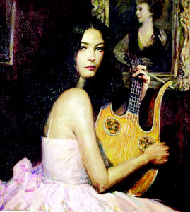 當華人社區(qū)對這位“英雄”贊不絕口時,徐純中也成了最受好萊塢明星歡迎的畫家。畫冊中一幅《甜蜜的琴聲》正是當紅女星凱瑟琳.澤塔.瓊斯的肖像畫。據徐純中回憶,澤塔.瓊斯當時特地從好萊塢借了一把十分名貴的古琴,還選了一件粉色衣服,來突出自己象牙白的膚色。不過,性格活潑的澤塔.瓊斯每次坐不到十分鐘,就要起身吃東西、接電話,或者吩咐仆人做什么事。徐純中笑說,“過了3個半小時,我還沒有畫完,澤塔.瓊斯有些不耐煩了。于是,我只能帶著未完成的初稿回去上色。作品完成后,她對我的作品非常滿意,并與我相約每隔兩年,為她畫一次肖像,現在我已經著手第三幅了!