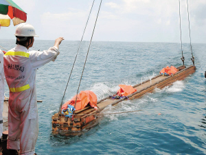 據(jù)介紹,在能見度幾乎為零的31米水深處進(jìn)行“海底穿梁”,史無前例,難度相當(dāng)大。交通部廣州打撈局克服海底含沙泥層阻力大和作業(yè)現(xiàn)場浪涌大等種種困難,不斷創(chuàng)新工藝,優(yōu)化工序,用了2016班次水,順利、安全地穿過36根底托梁。