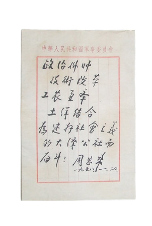 記者從辛先生提供的照片上看到,手跡為9橫行題詞,用毛筆寫(xiě)在中華人民共和國(guó)軍事委員會(huì)16開(kāi)信箋上,信箋為宣紙。內(nèi)容為:政治掛帥、技術(shù)改革、工農(nóng)并舉、土洋結(jié)合,為建好社會(huì)主義的大澤公社而奮斗!(記者 胡紅波)