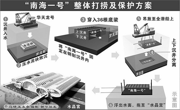 魏峻說,由于“南海一號”所在海域的海水能見度幾乎為零,水太深,采用傳統(tǒng)的水下考古方法,將無法對沉船和船載文物進(jìn)行準(zhǔn)確的測繪和記錄,必然會造成不少珍貴文物考古信息的丟失。古沉船在水下浸泡了800多年,船體非常脆弱,即使船載文物全部打撈出水,對于沉船本身的水下考古打撈也將會是一件非常困難的工作。因此,經(jīng)多方面專家的反復(fù)論證和研究,決定對“南海一號”沉船進(jìn)行整體打撈:將沉船、載物與其周圍泥沙按照原狀固定在特殊的鋼制沉箱內(nèi),將分散、易碎的文物一體化、一次性吊浮起運,然后遷移到能人為控制環(huán)境、保護(hù)較好的“水晶宮”中進(jìn)行科學(xué)的水下考古發(fā)掘。