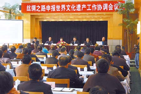12月28日上午9時(shí),絲綢之路申報(bào)世界文化遺產(chǎn)工作協(xié)調(diào)會(huì)議在蘭州飯店8樓會(huì)議室召開,國(guó)家文物局局長(zhǎng)單霽翔、甘肅省副省長(zhǎng)咸輝、國(guó)家文物局文物保護(hù)司司長(zhǎng)顧玉才及79名相關(guān)省區(qū)代表參加了當(dāng)天的會(huì)議。會(huì)上,單霽翔向與會(huì)代表強(qiáng)調(diào)了絲路申遺的重大意義,并指出了全國(guó)48個(gè)申遺點(diǎn)存在的問題和不足。